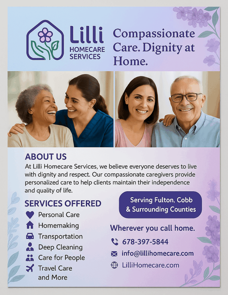 Lilli Homecare Services LLC is a private, non-medical homecare agency based in Georgia, founded from a deeply personal experience of caregiving. Our mission is to preserve dignity, foster independence, and bring joy to everyday living through compassionate, client-centered care tailored to each individual’s needs.